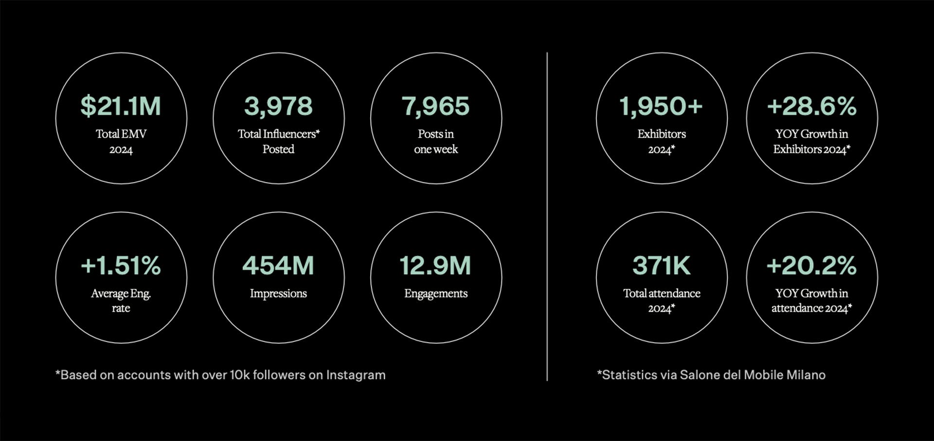 We tracked over 18K social media profiles attending Milan Design Week, tagging hundreds of participating brands across categories to analyze their Earned Media Value (EMV) and Share of Voice (SOV). For a comprehensive understanding of our methodology and how Lefty measures impact.