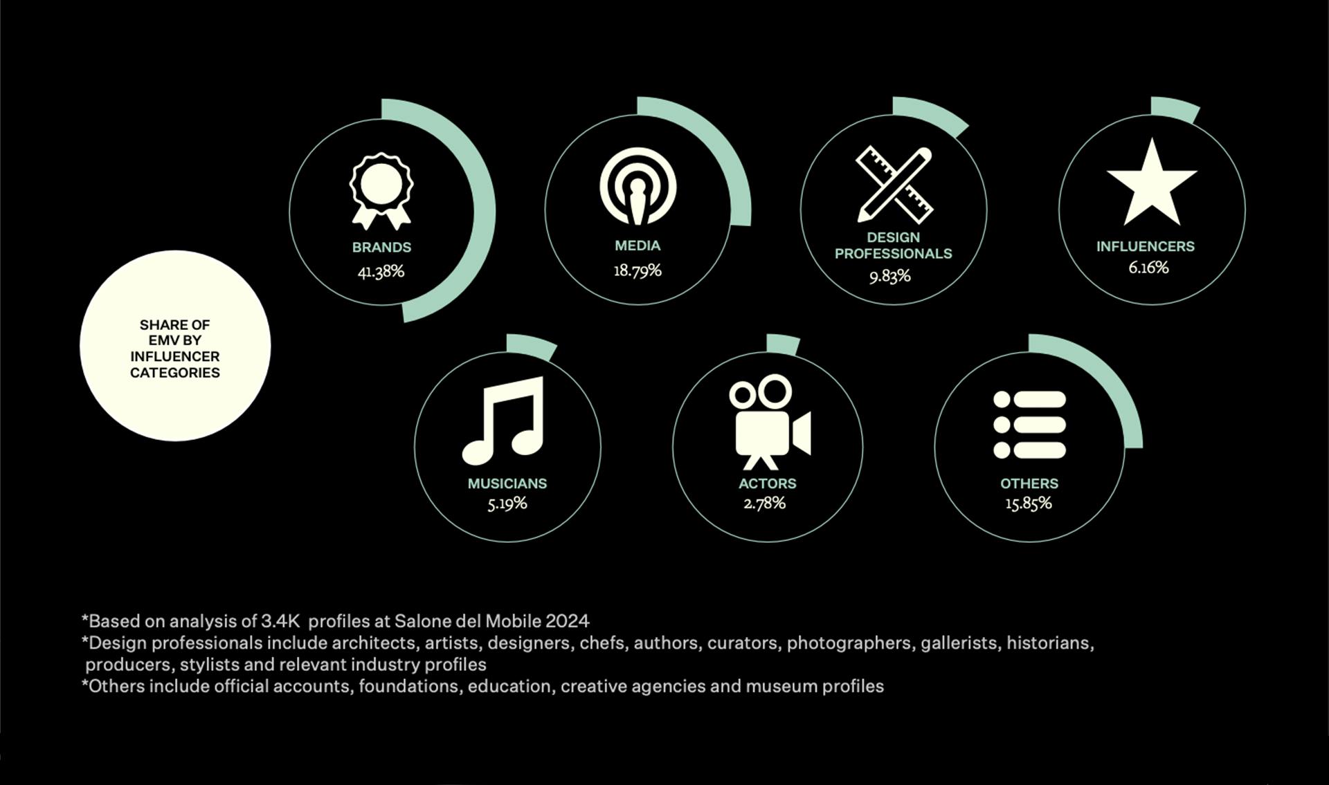 As crowds pour into Milan, audiences turn to design publications to guide their visit and help curate the standout exhibitions amongst a bevy of options across the city. Design media continues to be a reputable source of information and a powerhouse in the digital circuit. This year, media titles generated $4M EMV— 19% of the week’s total share of voice across socials. A steady increase in EMV after the Monday of Salone, when press previews occur, shows the media’s ability to drive the conversation.