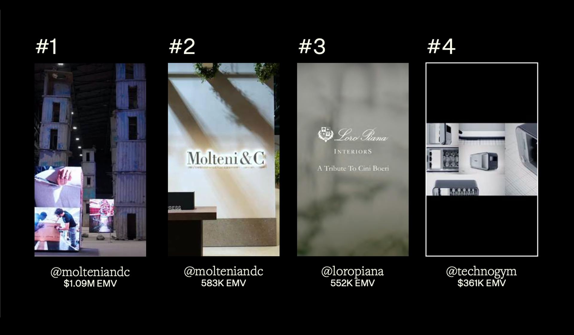 Part of the success of fashion brands in the digital ecosystem of Milan Design Week is their expertise in influencer strategy. German brand MCM Worldwide invited Ed Westwick and Chiara King to unveil the launch of its Wearable Casa collection. Both talents topped the most visible profiles, generating over $600K in EMV for the brand. Meanwhile, the success of Loewe and Loro Piana was — in part — thanks to their relationship with talent who were present at their event. Loewe worked with TikToker Ayamé to promote its showcase of lamps with a video accumulating over 1.5M views on TikTok, while Loro Piana invited many digital native talents, including fashion-parody account Angela Hicks, whose fun-filled content for the brand garnered $26K EMV, showcasing how humor and authenticity cut through the social media space.