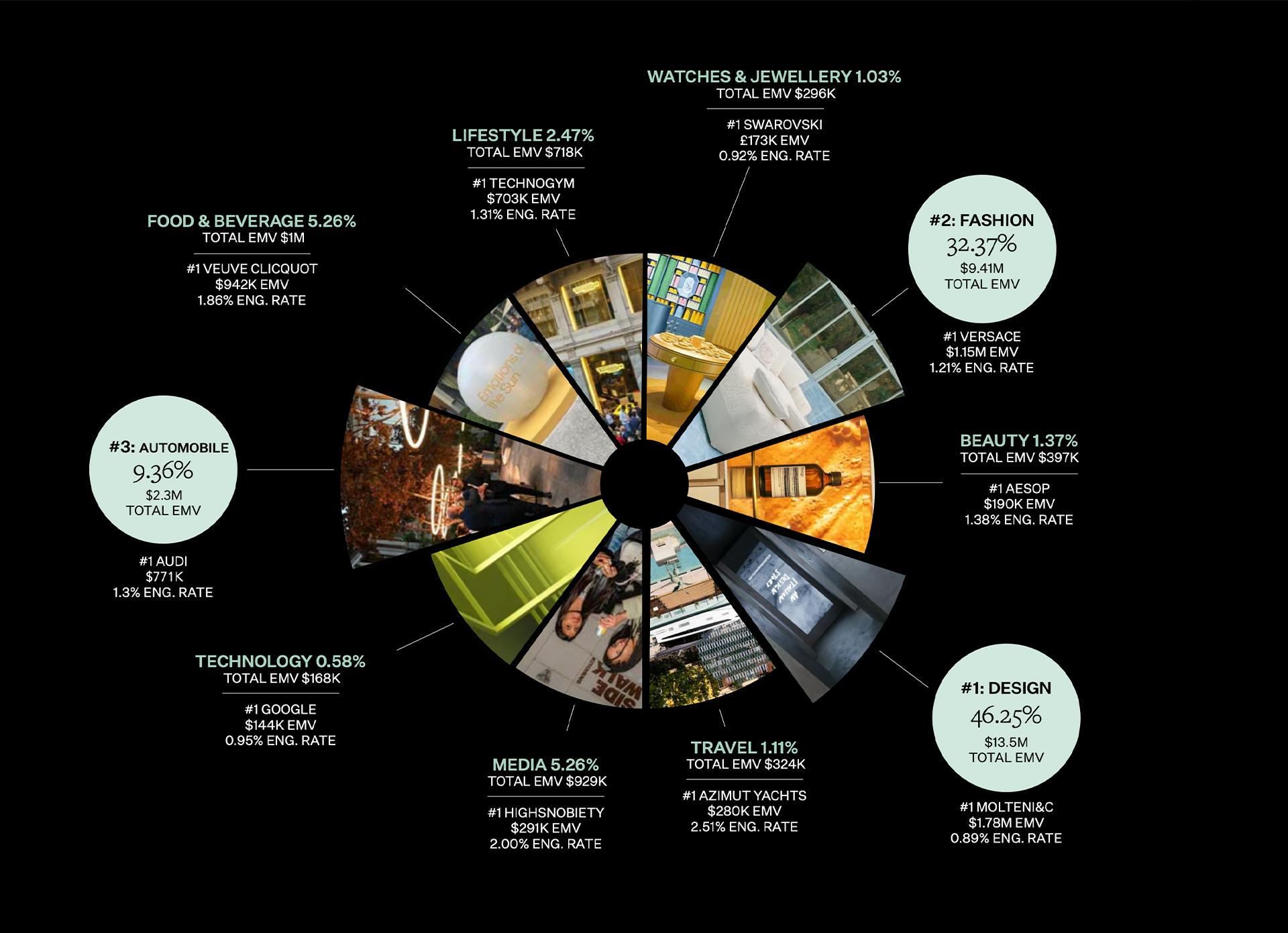Luxury fashion brands continue moving across categories to widen their cultural gravitas. Leveraging FuoriSalone to cement their ties to the design world, activations ranged from furniture showcases to collaborations with esteemed designers to interactive programs designed to inspire the design audience. As a result, fashion brands generated an overall EMV of $9.41M, making it the second biggest category to drive noise after design.