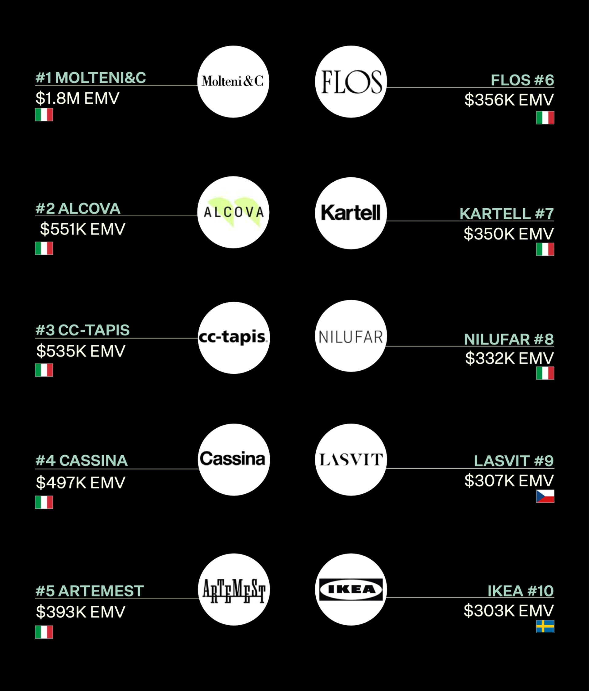 Earned media value unveils influential voices' true impact and signifies key players' reach. However, a closer look at the volume of posts surrounding each event paints a clearer picture of overall popularity. Among the top ten, ALCOVA, FLOS, CASSINA, and NILUFAR emerged as the most buzzed-about names, indicating their events attracted the highest footfall this year.