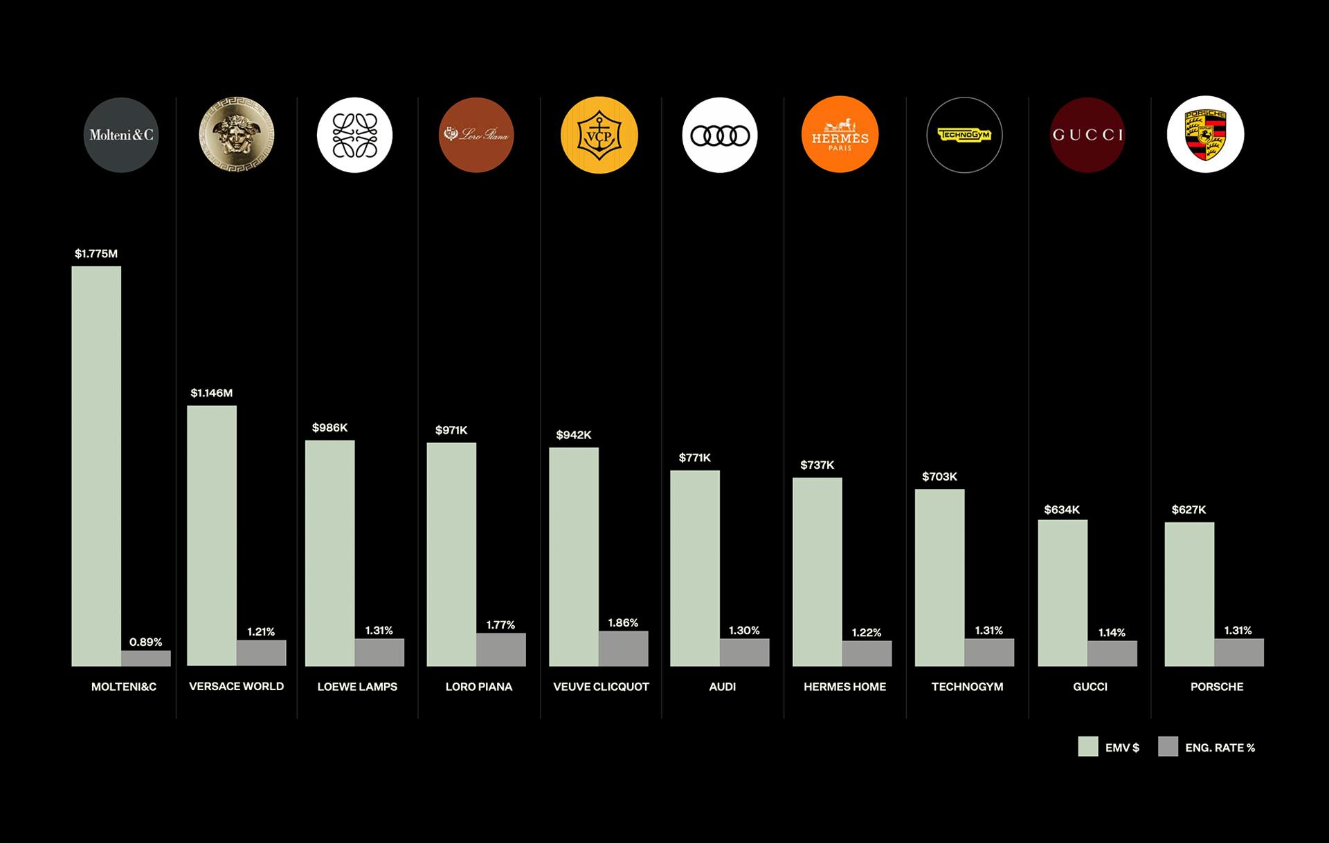 From Salone Satellite, founded by Marva Griffin, through to Alcova and Capsule Plaza, the appeal of emerging talent was evidenced on the grid with Alcova generating up to $551K EMV. Brands should look to partner with younger designers who generate buzz through conceptual creations that catch audiences’ attention online.