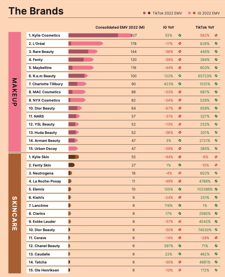 Throughout 2022, there has been a significant switch in how makeup and skincare brands market themselves. Lefty’s data suggests that TikTok has become an increasingly legitimate marketing channel, overtaking Instagram in EMV annually. So much so that brands who have invested more in TikTok than Instagram are growing faster in EMV, suggesting a continued trend toward TikTok as the platform to invest in and experiment with for social media marketing in 2023.