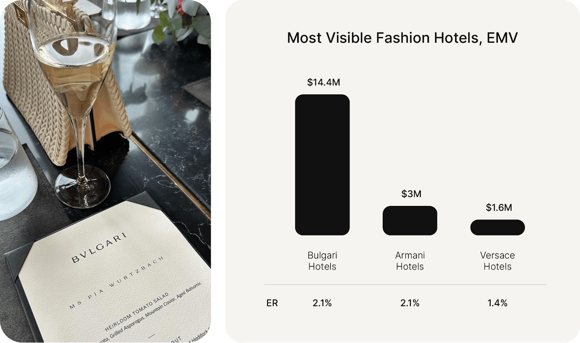 Between 2023-2024, Hathaway posted a single Instagram post to promote the hotel, but even with just one post, her influence was so profound that she drove a staggering $1.76M in EMV. This accounted for 12% of the brand's total visibility for the year. Her engagement rate also soared to 6.4%, which is a testament to her highly engaged audience and the exceptional performance of content from high-profile and branded events on social media