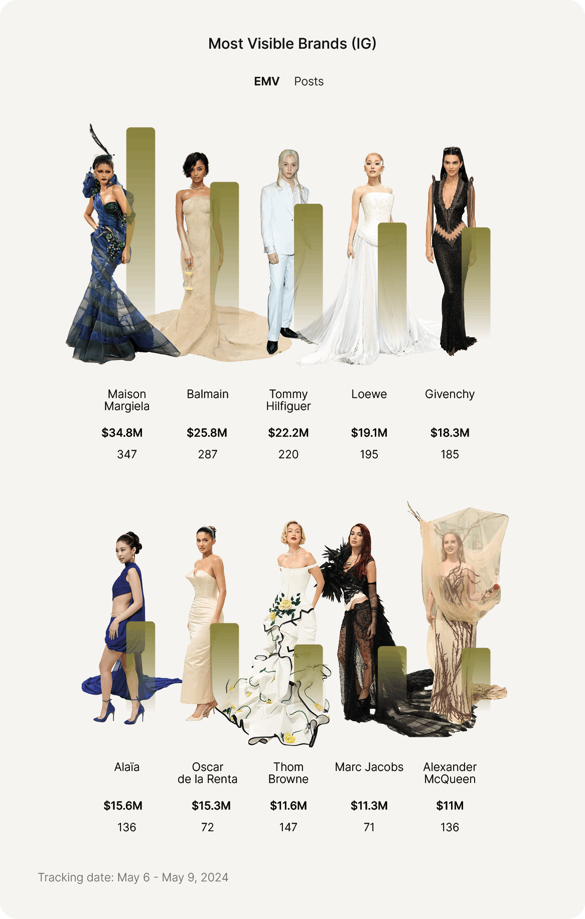 The influencer ranking study is based on the analysis of 198 attendees at Met Gala 2024 who have tagged a participating brand’s Instagram account post. ( Posts, Videos, Carousels, and Stories).