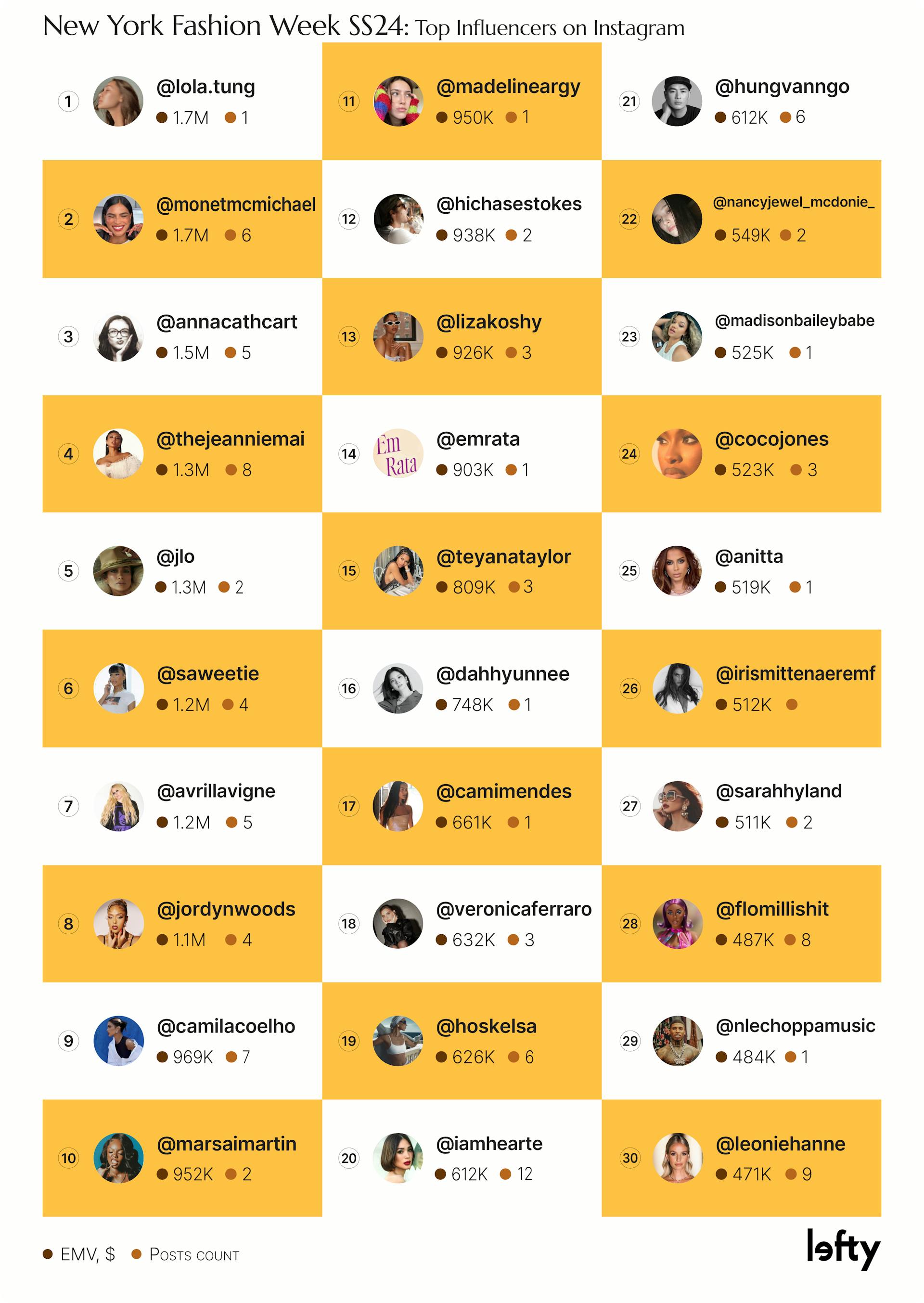 Lefty conducted a comprehensive analysis of all brands showcased at Women's Fashion Week to determine the level of visibility each brand and collection received on social media. We focused on identifying the key celebrities and influencers responsible for generating the most visibility. To measure this, we heavily relied on Earned Media Value (EMV), a metric that quantifies the monetary value equivalent to the cost of achieving the same online visibility. Our calculation formula is as follows:
