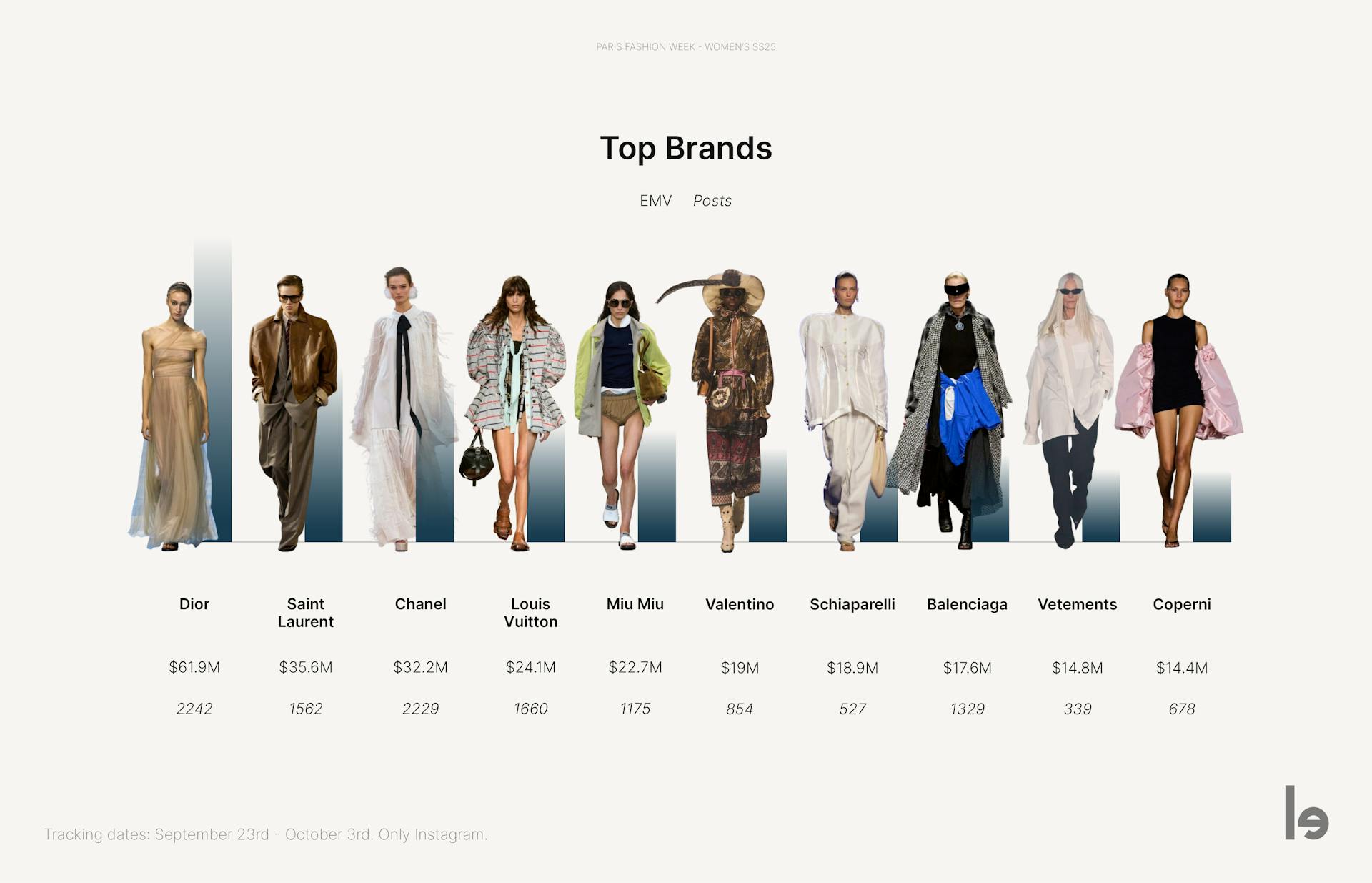 Dior was the top brand, generating the highest EMV at $61.9 million. The brand secured its position by enlisting prominent figures and ambassadors like Thai actor Apo Nattawin and brand ambassador Jisoo from BLACKPINK. Saint Laurent followed in second place, experiencing a solid 23% increase in EMV compared to the previous season. The brand's partnership with brand ambassador Rosé from BLACKPINK created significant visibility on Instagram. This season, collaborations with South Korean and Thai stars, especially brand ambassadors and members of BLACKPINK, were the key leaders propelling brands to the top of the visibility ranking.The Top Influencers of Paris Fashion Week Womenswear SS25