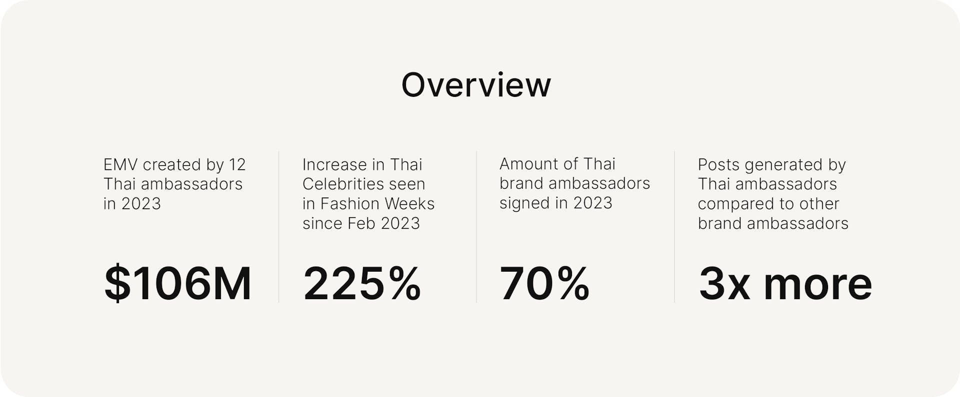 The effectiveness of these partnerships goes beyond mere visibility. The 12 Thai stars signed to luxury brands generated a staggering $106 million in Earned Media Value (EMV) for their respective brands in 2023—a testament to their powerful influence and engaging content.